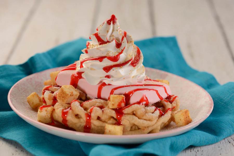 - Strawberry Cheesecake Funnel Cake topped with strawberry ice cream, cheesecake crumbles, strawberry drizzle, and whipped cream (New)
