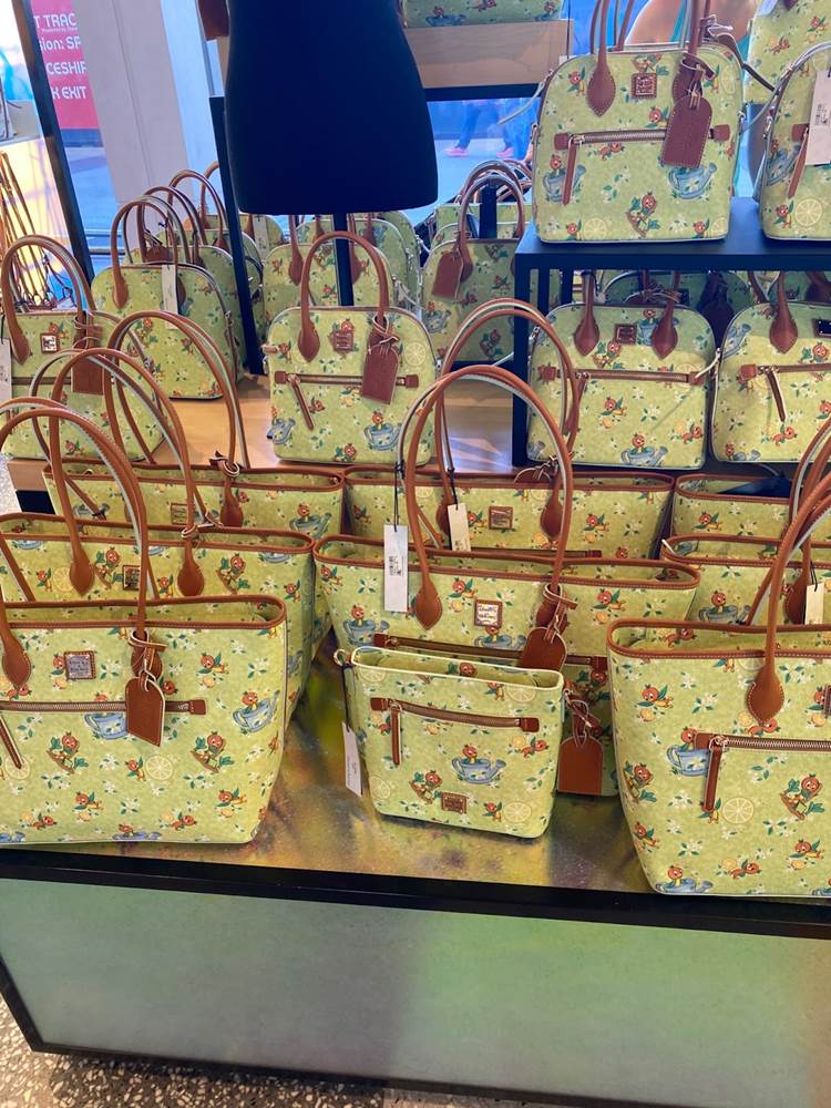 We start off with this fabulous Orange Bird Dooney and Burke purse. A light green background provides the perfect base for the Orange Bird to flutter around orange blossoms and splash in an oversized watering can.