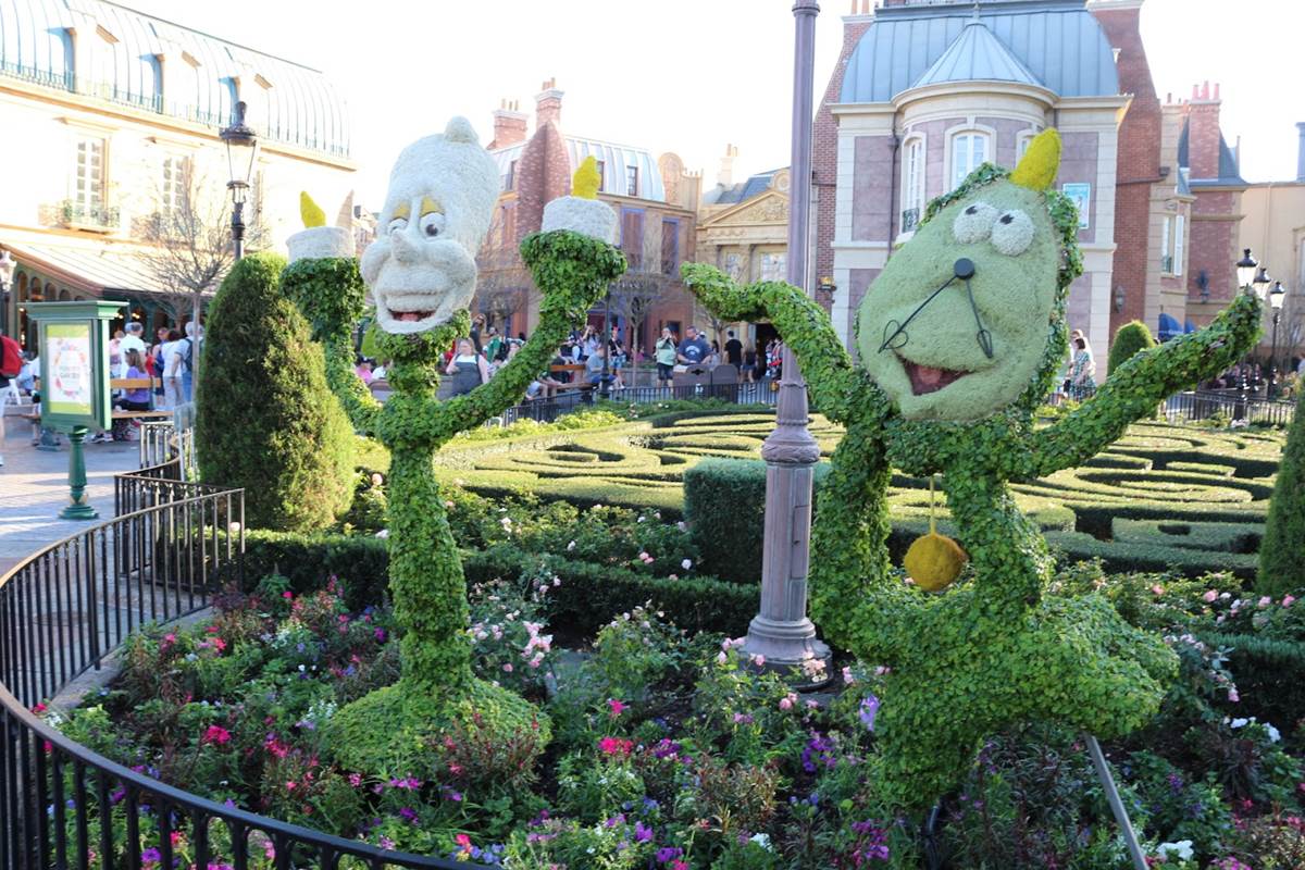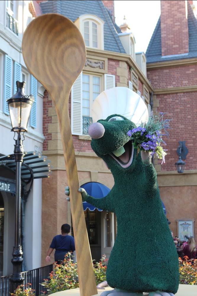 In the France Pavilion, you can see Remy beckoning towards his new attraction, Remy’s Ratatouille Adventure, as he stands atop some cheese. Remy in topiary form has actually become a somewhat permanent part of the pavilion, likely remaining in celebration of his new attraction. Elsewhere in the pavilion, you’ll find Belle and the Beast, along with Lumiere and Cogsworth, outside the theater where their sing-along film, as well as the classic Impressions De France, are shown.