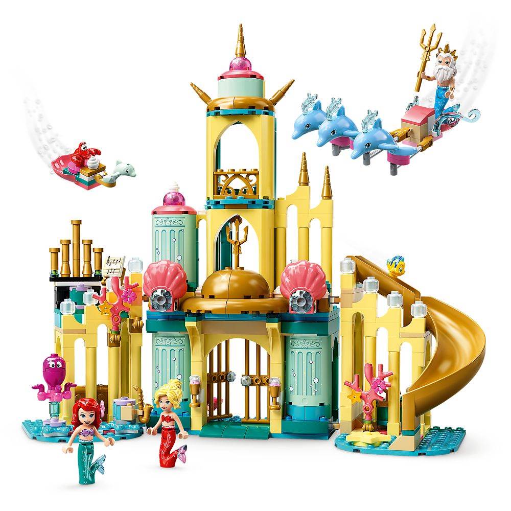 - Ariel's Underwater Palace set by LEGO features 498 pieces and includes mini-doll figures and their marine pals too.