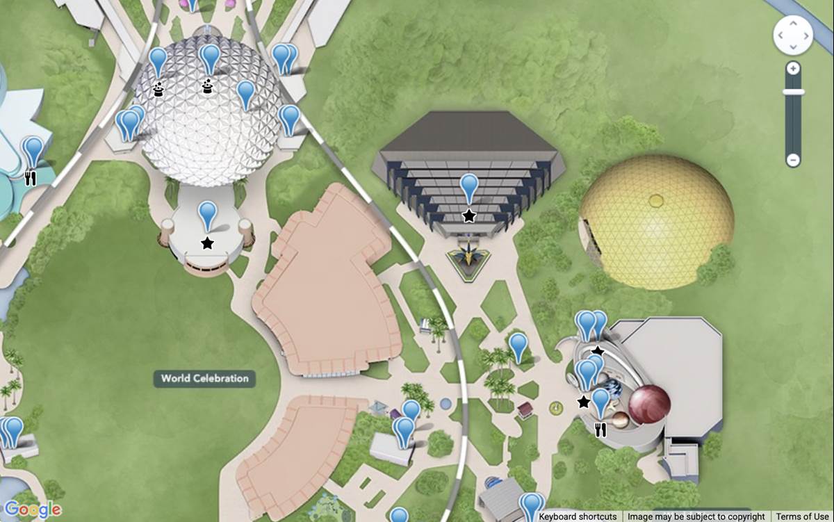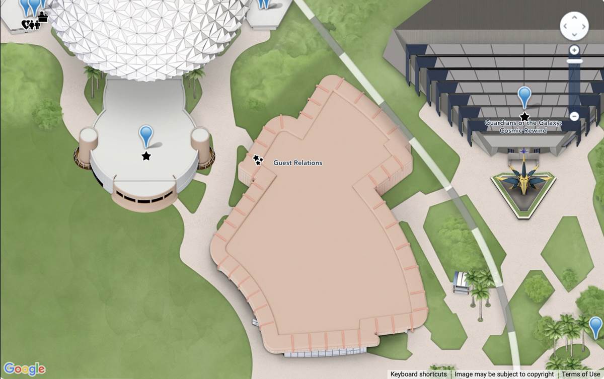 The former Universe of Energy building looks much the same as before, just with the addition of the Nova Corps Starblaster in front. Also, the main “big blue” attraction building is nowhere to be found on the map.