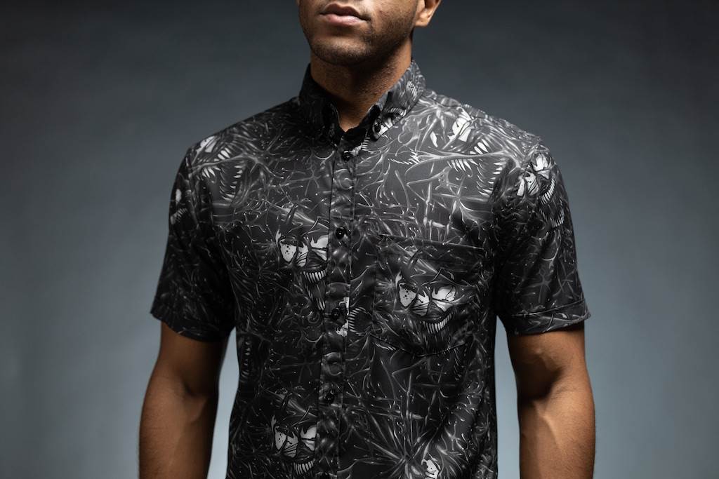 - The new collection includes unisex, short sleeve, button down shirts available in five fun patterns that highlight a few iterations of the webslinger (hi Miles!) and fan-favorite villain, Venom.