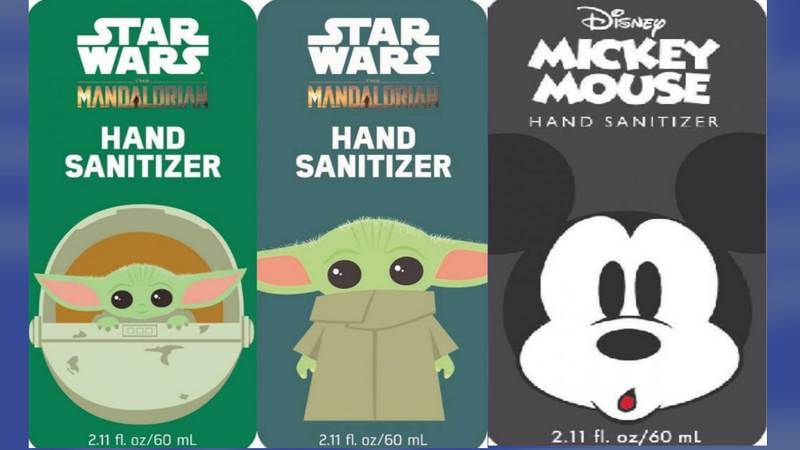 - This includes two hand sanitizers that are labeled with Mickey Mouse and the "Star War" series "The Mandalorian" Grogu, aka Baby Yoda.