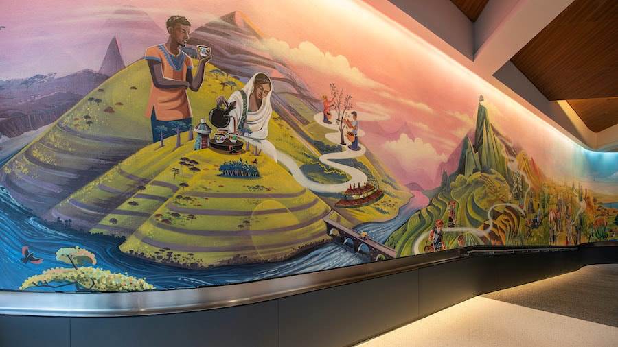 - As part of the eatery’s interior decor, there is a giant mural called “Global Gathering.” This magnificent piece of art depicts the heart of this restaurant – people from around the world gathering around food. It’s one of the largest murals Walt Disney Imagineering has ever created, and if you look closely, you’ll notice the scenes blend seamlessly from sunrise to sunset.
