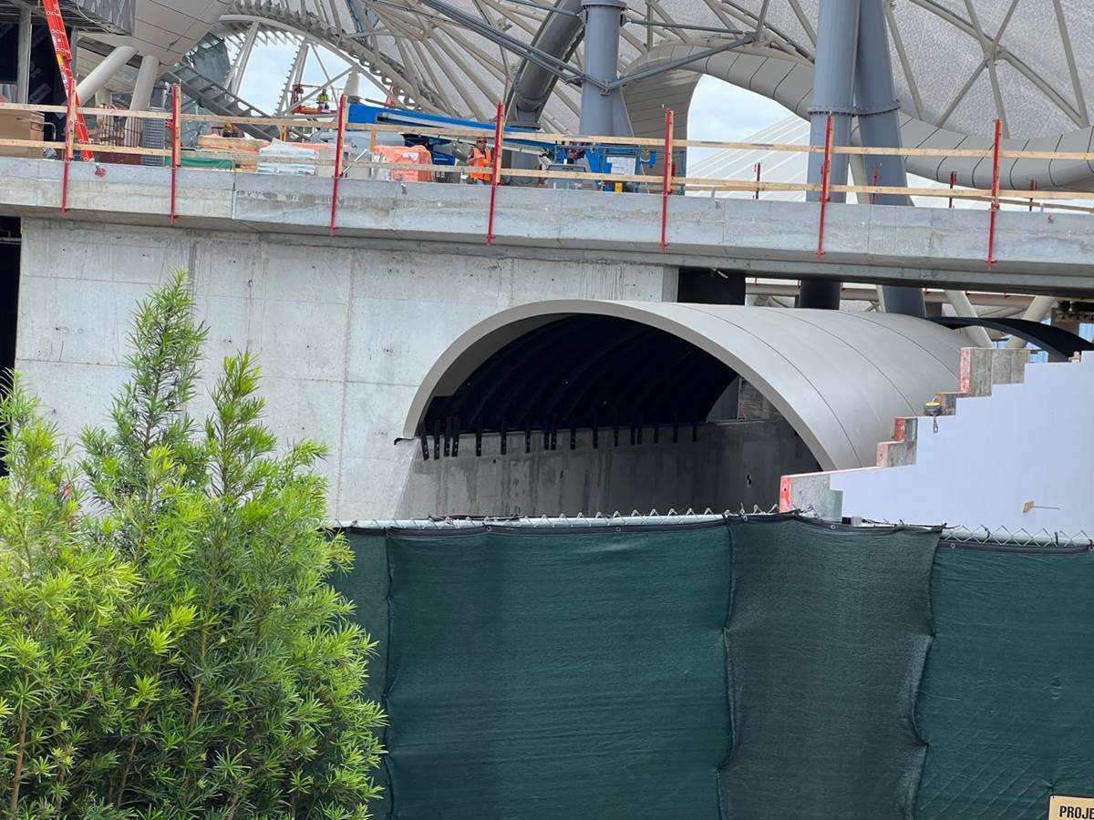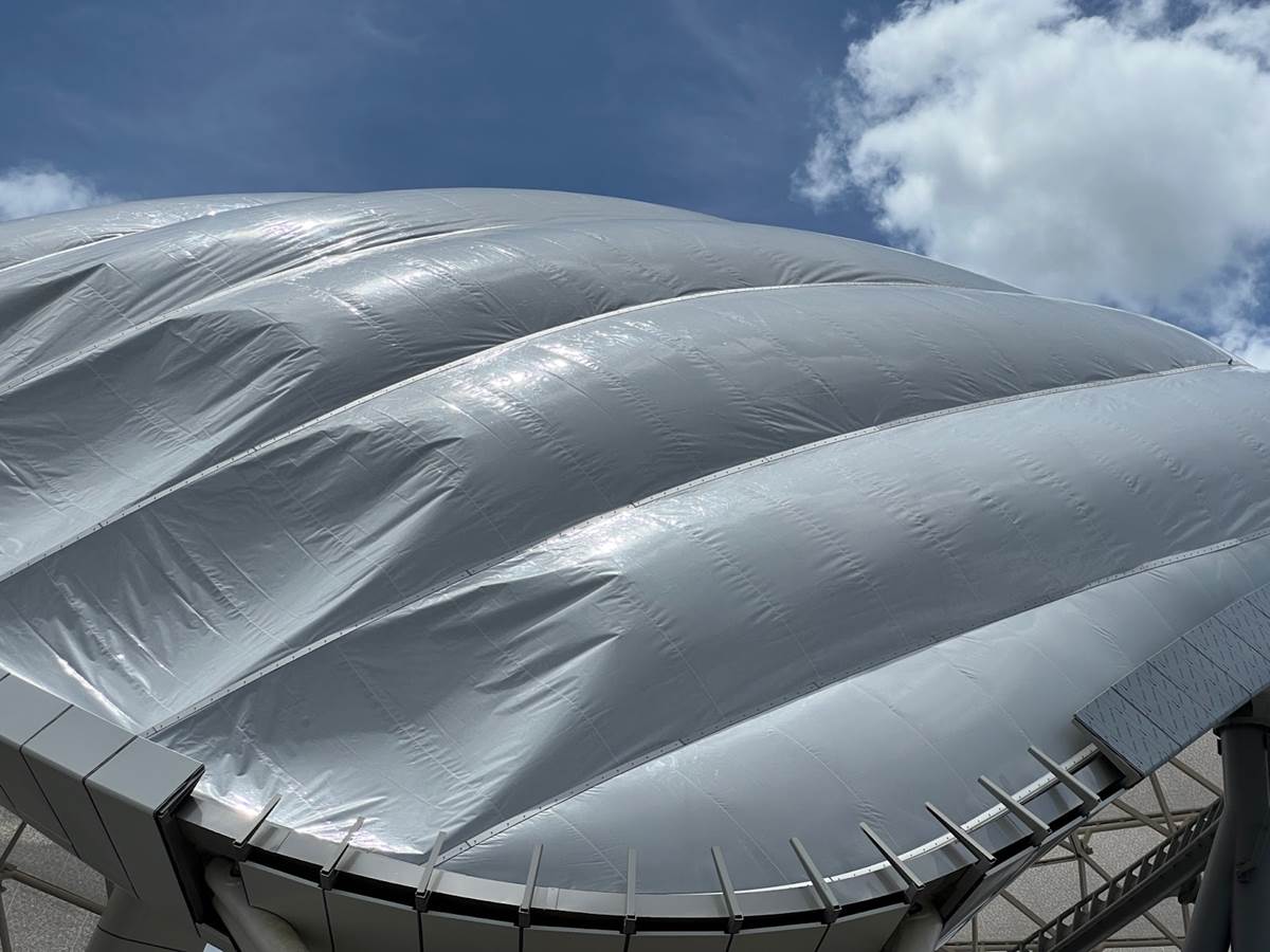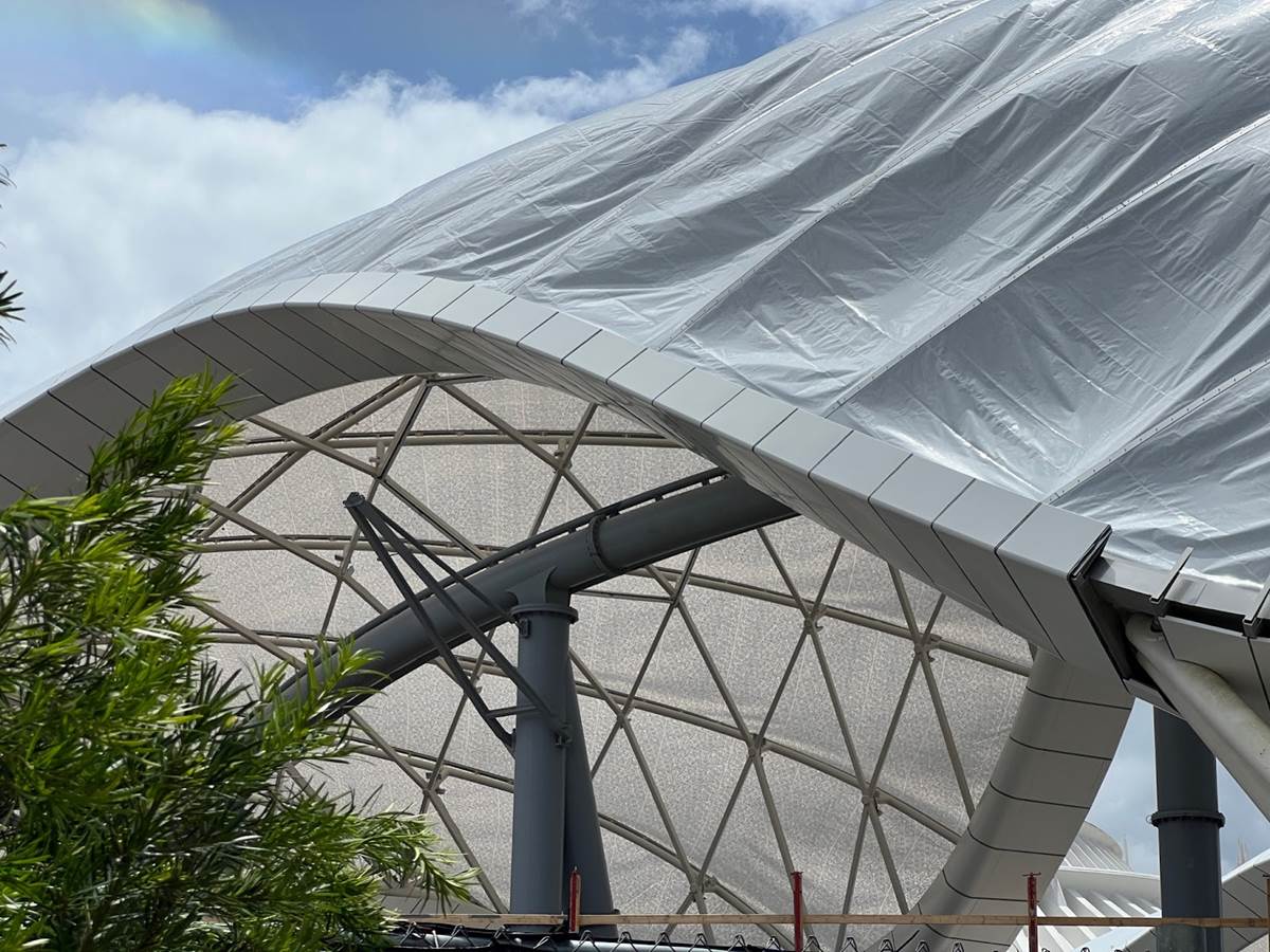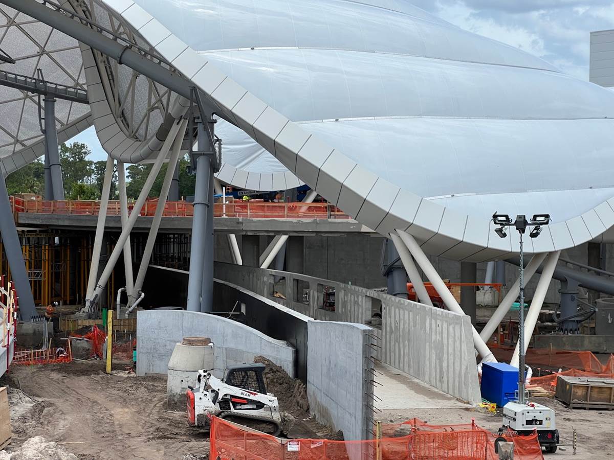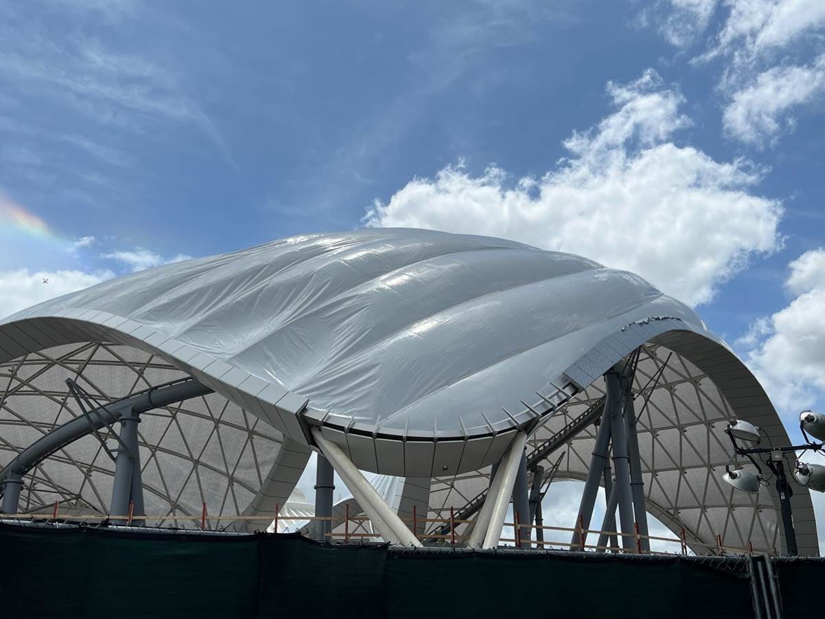 Construction appears to be mostly complete on the canopy over the exterior portion of the track, utilizing a special plastic polymer that is filled with air.