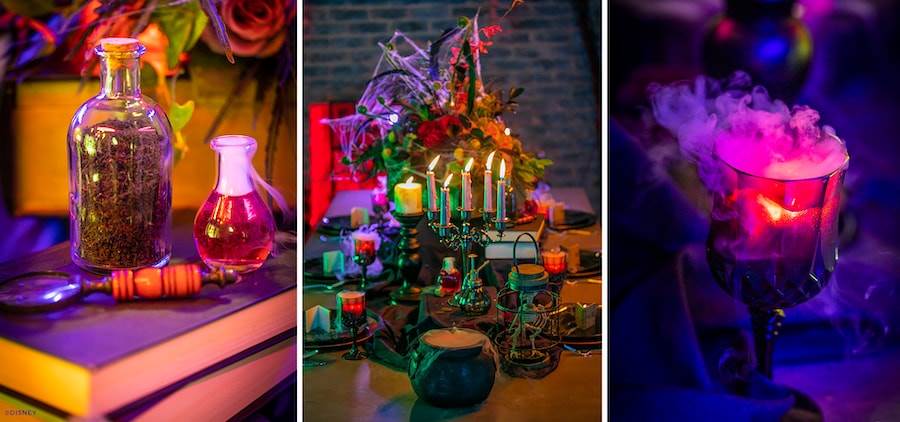 - Fill a glass jar or bottle with colored water, tea leaves, and food coloring to give the look of potion ingredients. You can use a box or book under the table cloth to give it some height, and then add mismatched candlesticks for extra effect.