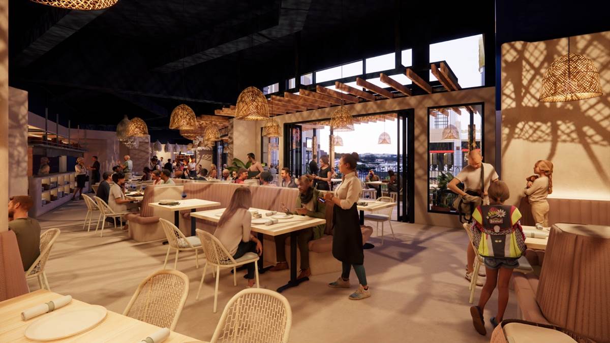 - Drawing inspiration from Southern California mid-century modern architecture, the west-end area will be a beautiful blend of vibrant color palettes, design elements and patterns influenced by the region, and will include an open lawn for relaxation and future events, and an even broader and diverse collection of dining and shopping.