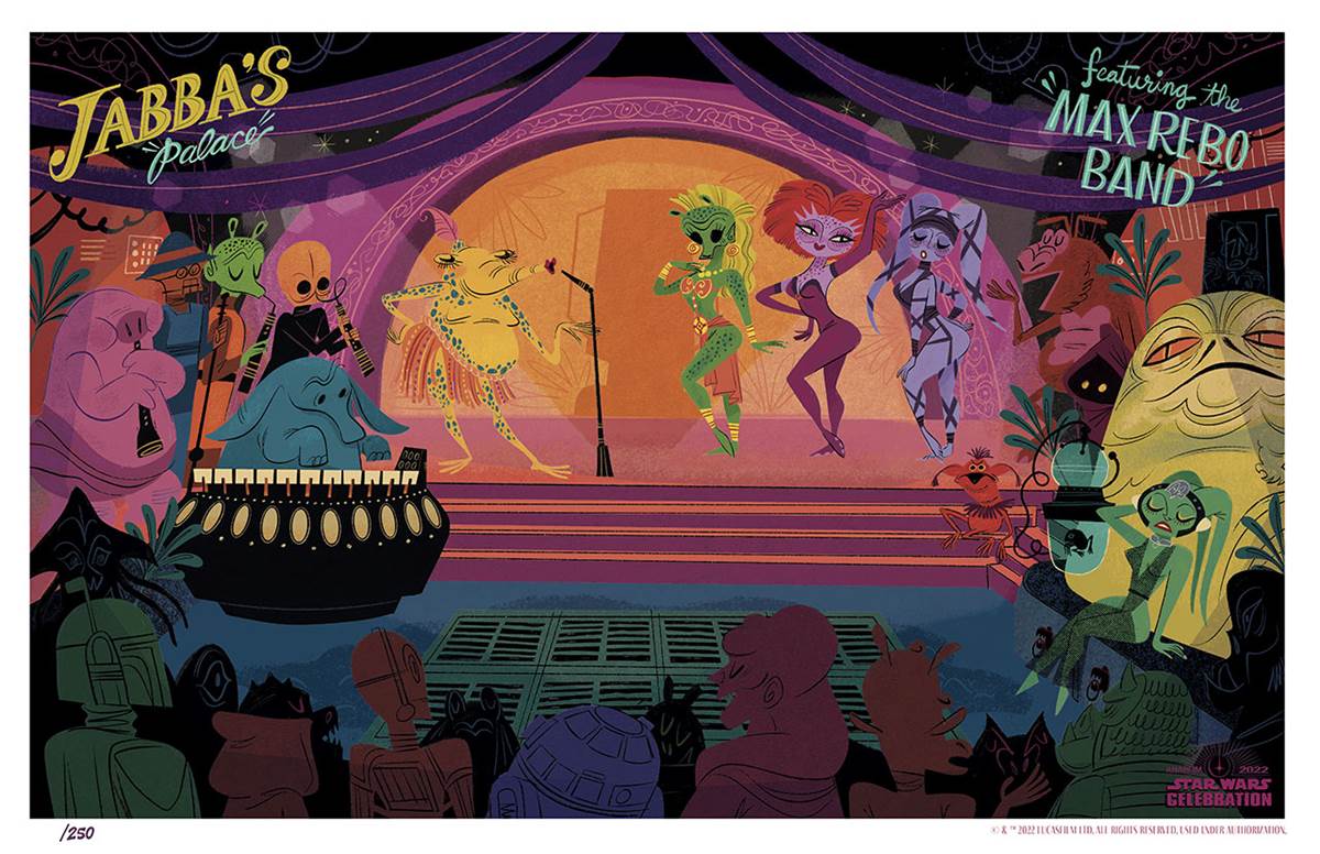 - ‘A Night with the Max Rebo Band’ is a playful, jazzy, colorful depiction of the band performing at Jabba’s palace. I’ve always loved this scene for its glam and the campiness of Sy Snootles and the rest of the band, and would imagine their concerts being an absolute blast — minus the fear of Jabba feeding anyone to a rancor by the end of it, of course!”