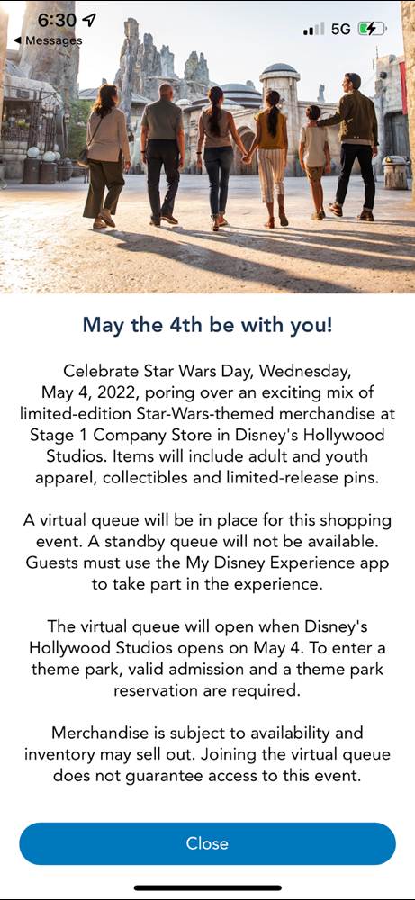 - Per a notification on the My Disney Experience app, you’ll be able to celebrate Star Wars Day on Wednesday, May 4th with an exciting mix of limited-edition Star-Wars-themed merchandise at Stage 1 Company Store in Disney's Hollywood Studios.
