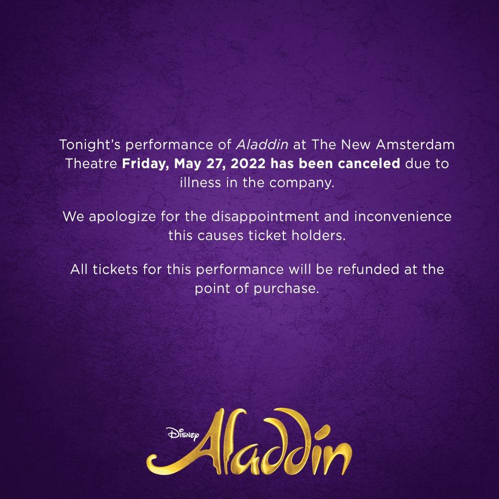 - Tonight’s (Friday, May 27th) performance of Aladdin on Broadway at The New Amsterdam Theatre has been canceled.