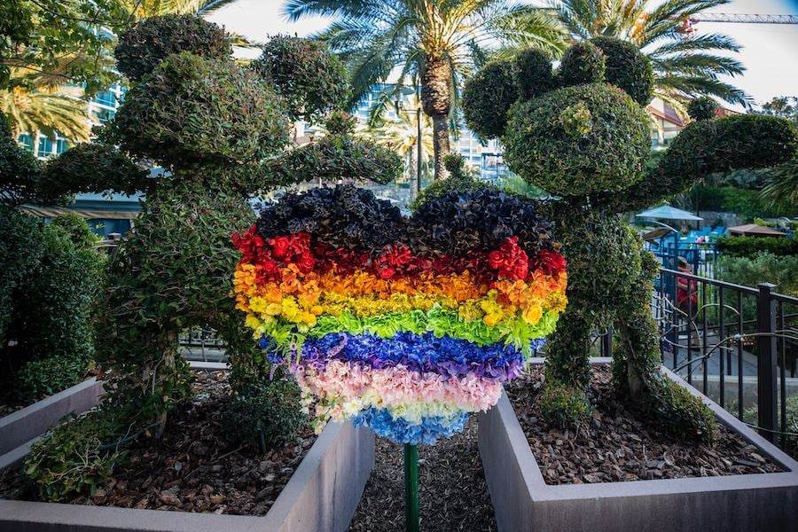 - Over at the Disneyland Hotel, be sure to stop and take in this beautiful rainbow heart-shaped topiary on display. This progressive pride flag floral was created by the Disneyland Resort Enhancement team.
