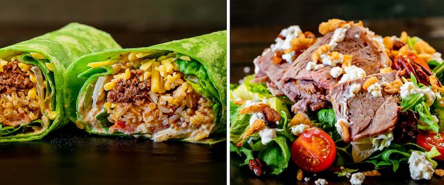 - Plant-based option, the Hoppin’ John IMPOSSIBLE Royal Wrap has seasoned plant-based meat with rice, black-eyed peas, “cheddar," lettuce, and Cajun dressing in a spinach tortilla.