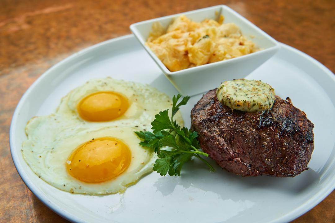 - The Boss: eight-ounce top sirloin steak with eggs any style and cheesy potato casserole