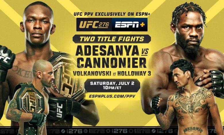- UFC 276: Adesanya vs. Cannonier presented by Modelo (Prelims) is part of a stacked card capping UFC International Fight Week 2022. The main card streams at 10 p.m. ET/7 p.m. PT exclusively on ESPN+ PPV, with the Prelims simulcast on ABC, ESPN, ESPN Deportes and ESPN+ at 8 p.m. ET/5 p.m. PT. The night’s action starts with Early Prelims at 6 p.m. ET/3 p.m. PT on ESPN, ESPN Deportes and ESPN+ (English and Spanish).