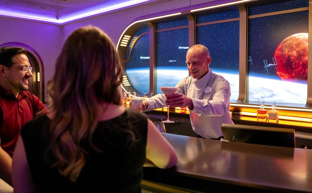 “For the first time on a Disney ship, guests embark on a space-jumping tour of the Star Wars galaxy at Star Wars: Hyperspace Lounge, a high-end bar styled as a luxurious yacht-class spaceship aboard the Disney Wish. This richly themed, immersive environment is reserved for adults every evening and offers interactive tasting experiences and signature beverages inspired by destinations such as Batuu, Tatooine and Mustafar, as seen out the viewport as guests jump to lightspeed from one planet to another."