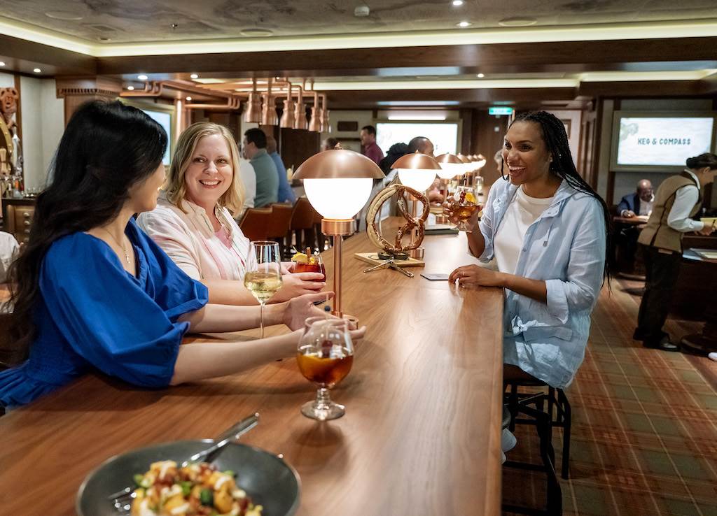 “The Keg & Compass pub aboard the Disney Wish celebrates the adventure and romance of the sea, evoking the rustic style of a late-1800s Norwegian sailor’s map room. The casual setting offers live sports on large TVs, a special selection of beers, an assortment of liquors, wines and cocktails, and pub fare."