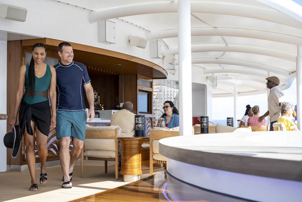 “Adults indulge in sun-drenched serenity at Quiet Cove, a peaceful refuge aboard the Disney Wish dedicated to lounging, sipping and soaking. Set away from the bustle of family activities, this secluded adults-only district features a luxurious infinity pool and poolside bar."