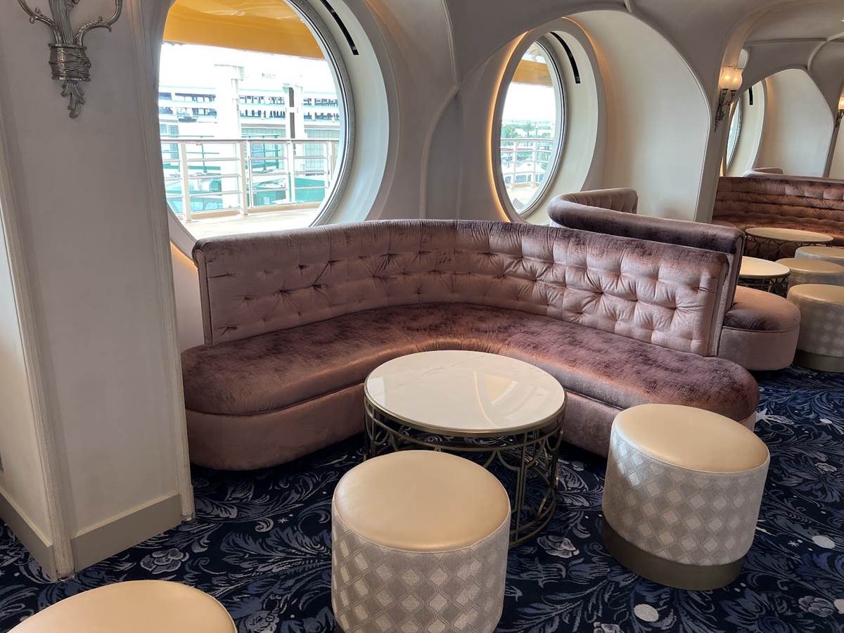 The Grand Hall is inspired by fairy tales like Cinderella, with a beautiful staircase that serves as a warm welcome to passengers as they come aboard the new ship. The chandelier evokes the imagery of pixie dust as it illuminates the venue. The shape was inspired by the Fairy Godmother’s spiral of magic she places around Cinderella in the film.