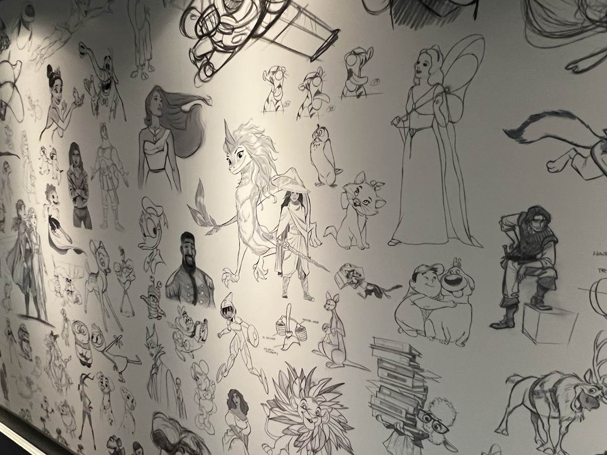 Decorated with black-and-white sketches of Disney and Pixar characters, the hub also features a stage and its own slate of special shows, activities and character appearances.