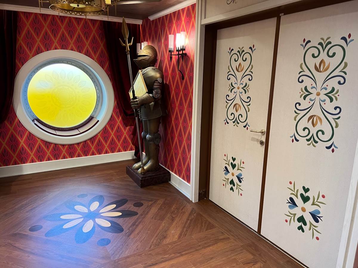 - This theater-in-the-round entertainment venue features dining tables surrounding a central stage, with performances and show effects spreading throughout the room. Invisible fiber optics embedded in the ceiling conjure Elsa’s icy magic, and panoramic windows magically transform from real-time ocean views to the colorful dancing lights of the Aurora Borealis.