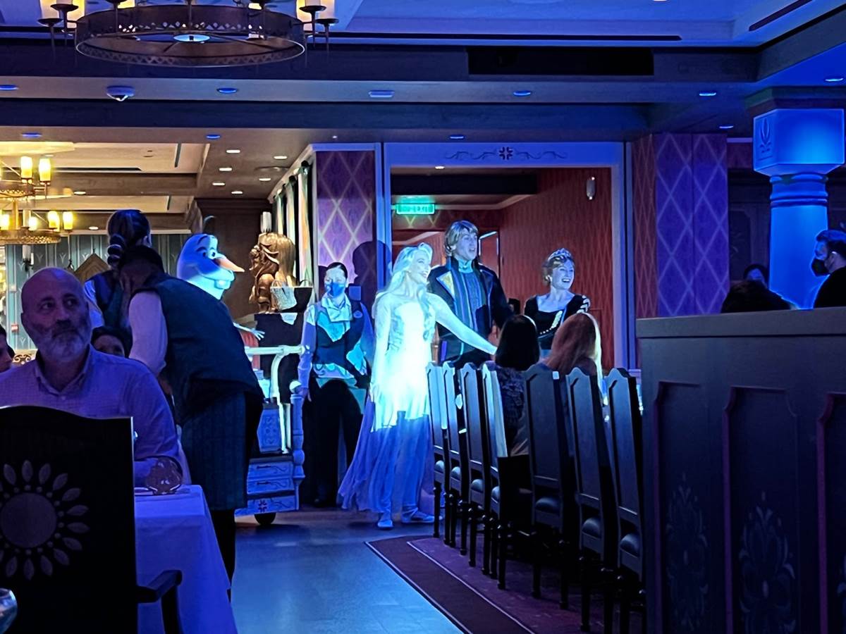 - Many of the loveable characters from Frozen, including Anna, Elsa, Olaf and even Wandering Oaken, come out to perform for diners.
