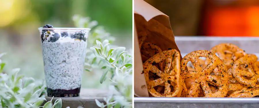 - Elsewhere in Star Wars: Galaxy’s Edge, at Docking Bay 7 Food and Cargo you’ll find the tasty Blue Milk Chia Pudding. This treat is made with a coconut milk and chia seed blend, fresh berries, pepitas, and shredded coconut. For a sweet and savory combination, Jat Kaa’s Coolers has Peka Wheat Gear Puffs, crispy wheat puffs in a savory and spicy seasoning blend.