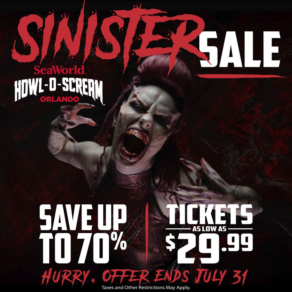 - There are big savings for park guests planning to attend this year’s Howl-O-Scream. Guests can save up to 70 percent, with Howl-O-Scream tickets as low as $29.99 during the Sinister Sale, which runs for a limited time through July 24th.