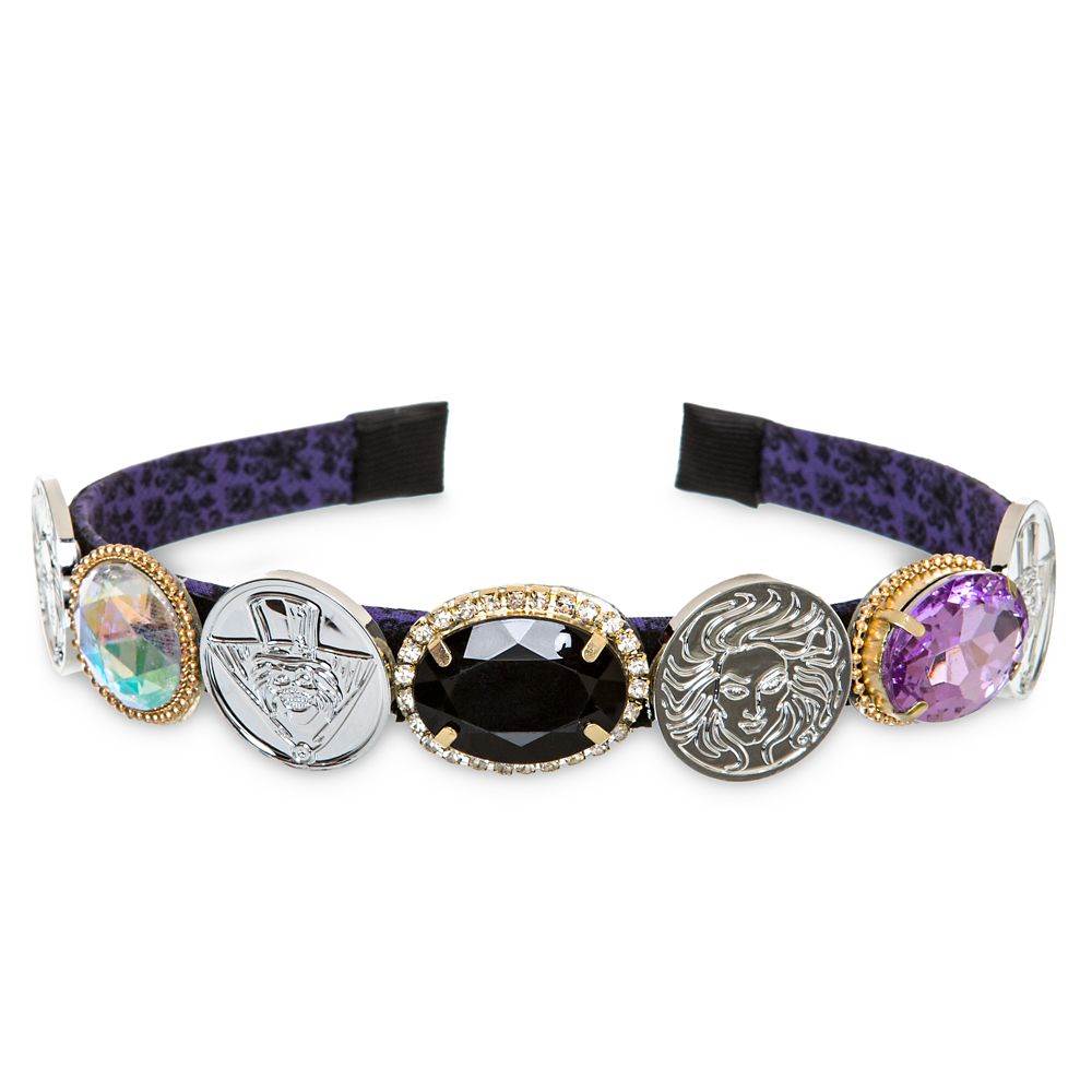 Celebrate the spooky ride with a gemstone headband that features colorful jewels and Haunted Mansion themed medallions featuring The Hatbox Ghost and Madame Leota. Tying the whole look together is the wallpaper pattern inside the band.