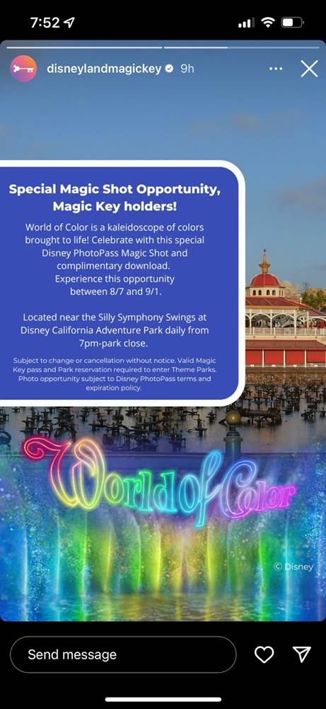 - Between August 7th and September 1st, Magic Key Holders at Disney California Adventure can head over near Silly Symphony Swings for a special photo featuring the park’s landmark nighttime spectacular, World of Color. This opportunity is available daily starting at 7:00 PM until park close.