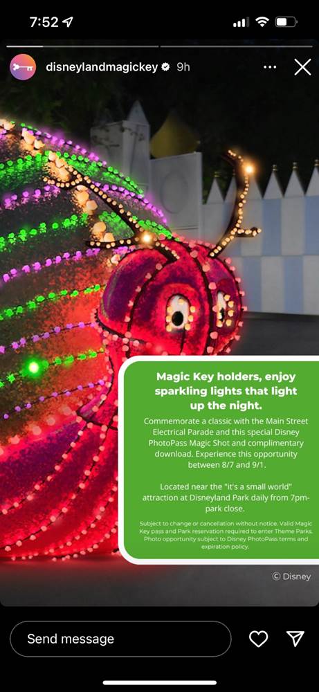 - Across the Esplanade at the original Disneyland Park, Magic Key holders can enjoy a special Photopass opportunity featuring the venerable classic Main Street Electrical Parade. Also available starting August 7th until September 1st, this offering can be enjoyed near “it’s a small world" at the park. Similar to the World of Color photo, this will be available daily starting at 7:00 PM until park close.