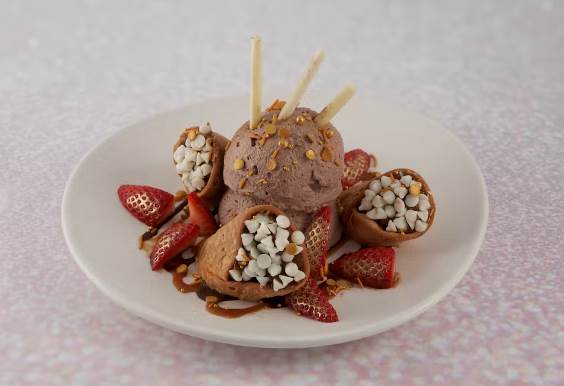 - Dulce de Leche Egg Rolls: Dulce de Leche Cannoli with chocolate mousse, chocolate & caramel sauce. Garnished with chocolate décor, gold dusted strawberries, and gold sprinkles.