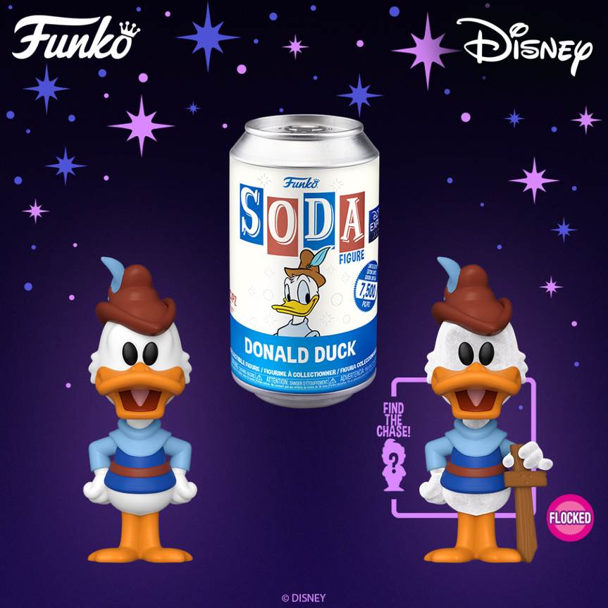 Donald comes to fans in a new Soda version and he’s dressed in a brown pointed cap complete with blue feather. His tunic is also blue with a brown belt. The chase variant is flocked and features the duck holding a wooden sword.