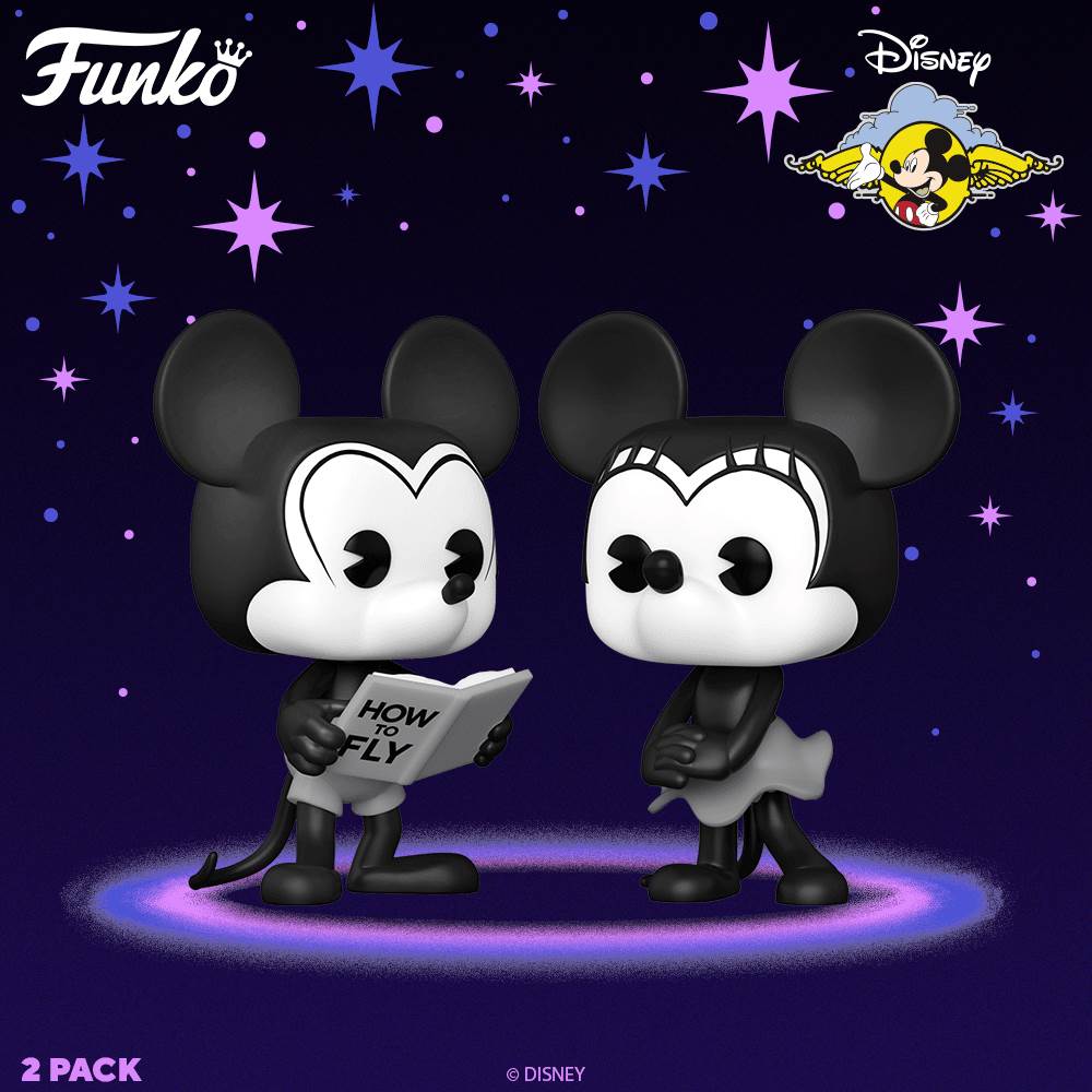 Well while we’re on the topic of planes, we might as well throw things back the black and white short, “Plane Crazy" where Mickey and Minnie first took to the skies! This two pack includes both mice and shows Mickey reading an instructing book “How to Fly" while Minnie looks over his shoulder.