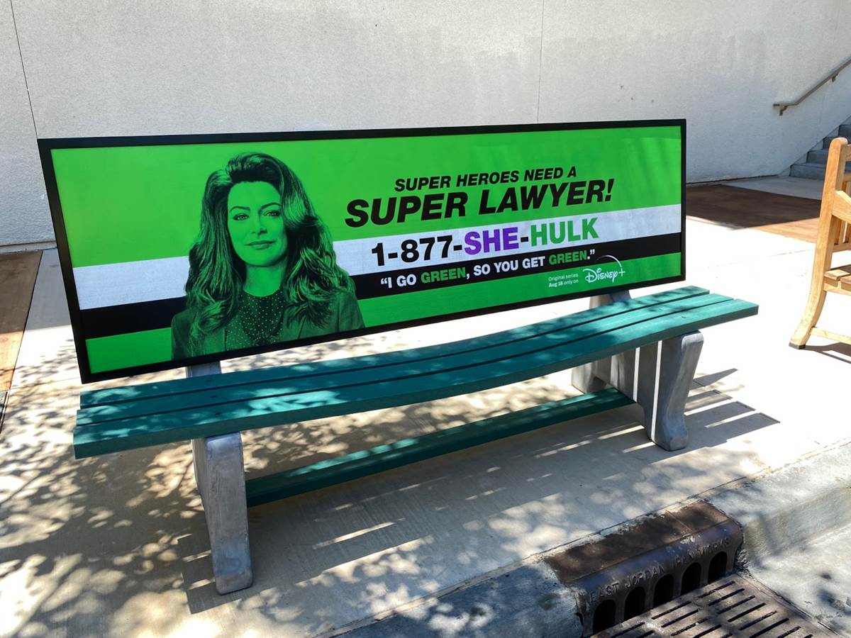- The bench features an advertisement for Jennifer Walters, a.k.a. She-Hulk, and her super lawyer service.