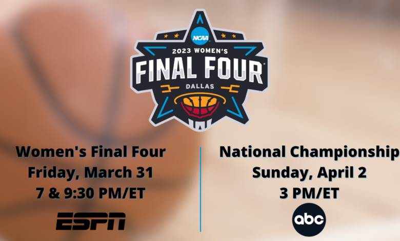 - The NCAA Division I Women’s Basketball Championship game will be broadcast live on ABC for the first time in 2023. The game will air Sunday, April 2, at 3 p.m. ET and will be played at American Airlines Center in Dallas. The 2023 Women’s Final Four semifinal matchups will air on ESPN at 7 and 9:30 p.m. on Friday, March 31.