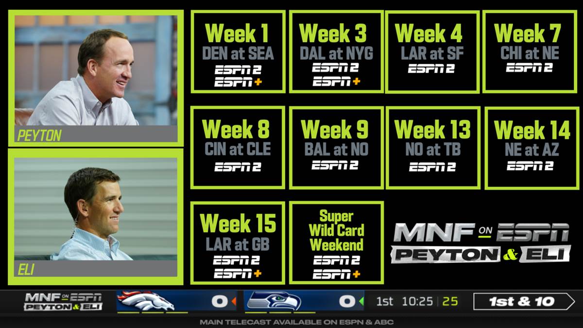 - The Emmy-award winning Monday Night Football with Peyton and Eli, with its off-the-cuff commentary, authentic reactions, entertaining facial expressions and treasure trove of guests, rides into its second season when Russell Wilson and the Denver Broncos travel to Seattle for the regular season debut of ESPN’s Monday Night Football (Sept. 12, 8 p.m. ET).