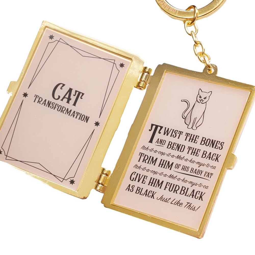 - As for the key chain, this brings a simpler but still totally mystical aura to your favorite bag or most important set of keys. Designed to look like the Spell Book the key chain opens to reveal the cat transformation spell so you can recite it whenever is handy!