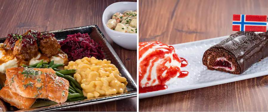 - Guests can also delight in family-style platters fit for royalty, where guests can indulge in their favorites or try something new. This family-style dining experience includes Traditional KjØttkaker featuring Norwegian meatballs or the Kylling og Melboller, a Norwegian take on chicken and dumplings. More classic American-cuisine is also available, with Mashed Potatoes and Gravy, Grilled Salmon, and Macaroni & Cheese. For dessert, the meal serves up both a Rice Cream with strawberry sauce and a Chocolate Roulade with lingonberry cream.