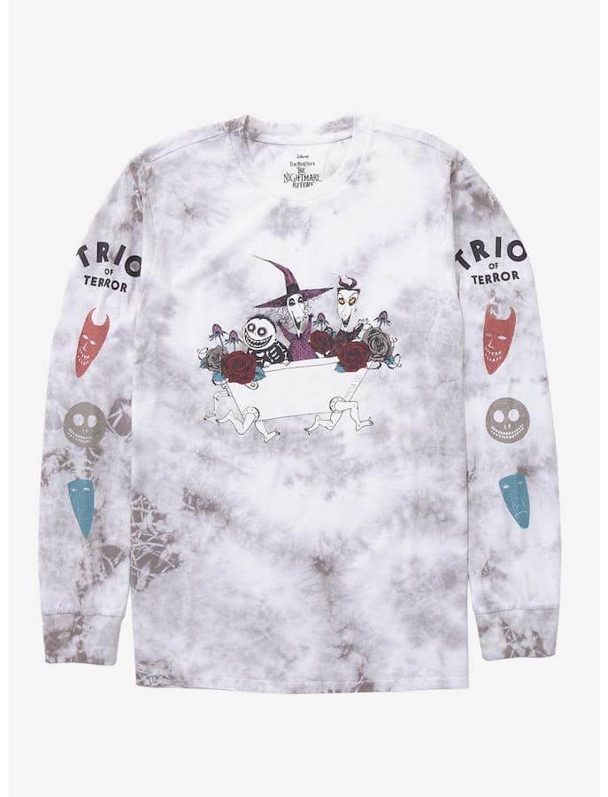 Hot Topic will outfit you with a The Nightmare Before Christmas Jack Jumbo Head Hoodie, while sister retailer BoxLunch delivers a terrific Trio of Terror Long Sleeve Tie-Dye T-Shirt.