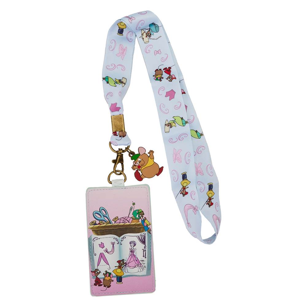 - On the front of the card holder, Cinderella’s small companions gather their sewing supplies. The reverse side features a clear slot perfect for holding your ID or park pass. Up above, a woven strap displays a motif of the mousey seamstresses.