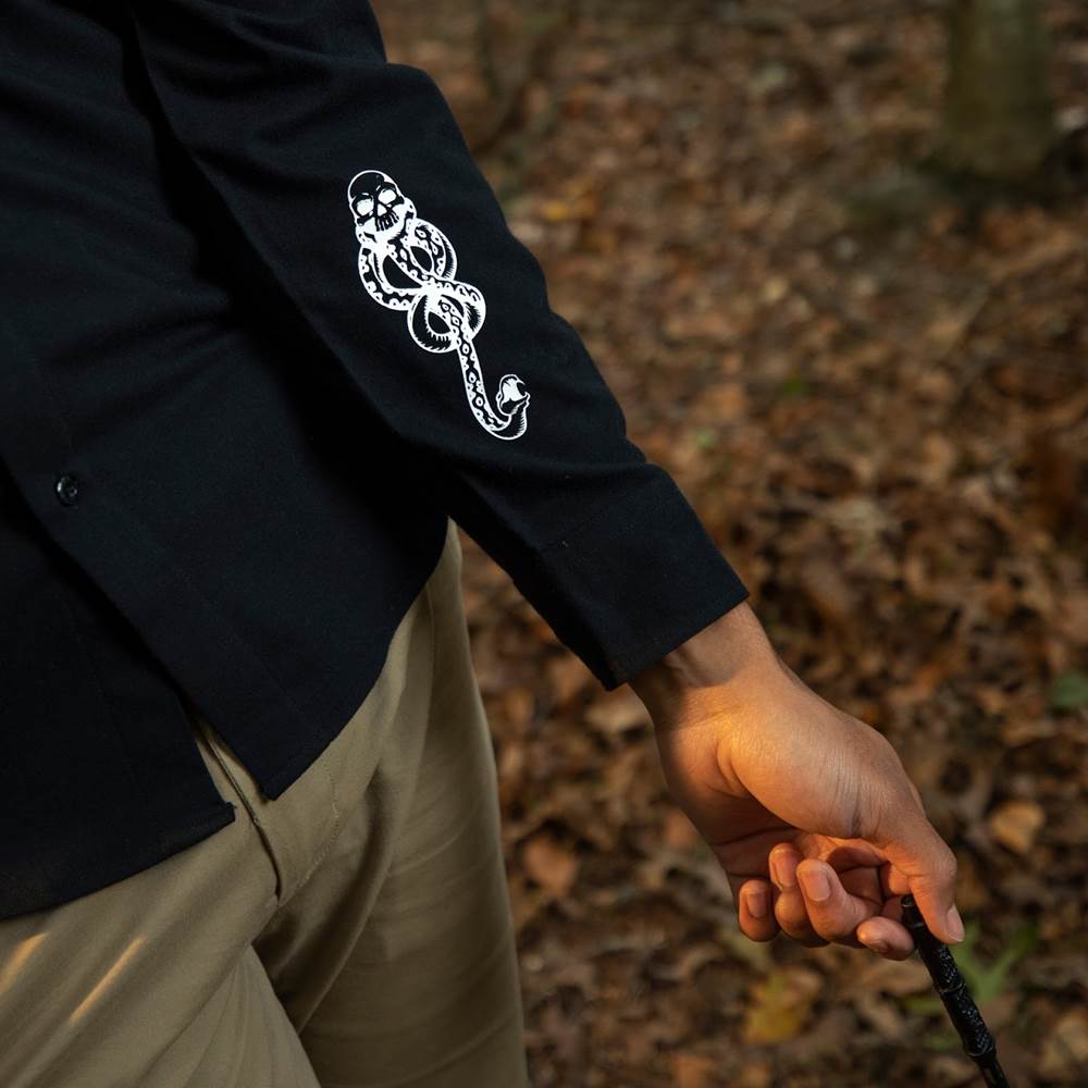 “Shadowy and forbidding like those who utter the incantation “Morsmordre," this BorlandFlex flannel is branded with the infamous Dark Mark. The skull with a slithering serpent tongue that adorns the sleeve is a menacing reminder of the evil that lurks around every corner of the Wizarding World. There may even be a sinister surprise hiding under the collar. Go ahead, pop it... embrace your dark side."