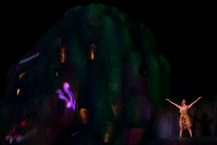 - Original to the Florida version of the show is several minutes featuring moments as seen in Pocahontas. Characters would float out in canoes while Governor Ratcliffe would instruct everyone to dig, dig, and dig before the whole scene would erupt into a battle sequence that featured a “flaming arrow," stunts, and pyrotechnics before using the romance between Pocahontas and John Smith to segue into the iconic romance sequence that features Beauty and the Beast, The Little Mermaid, and Snow White and her prince.