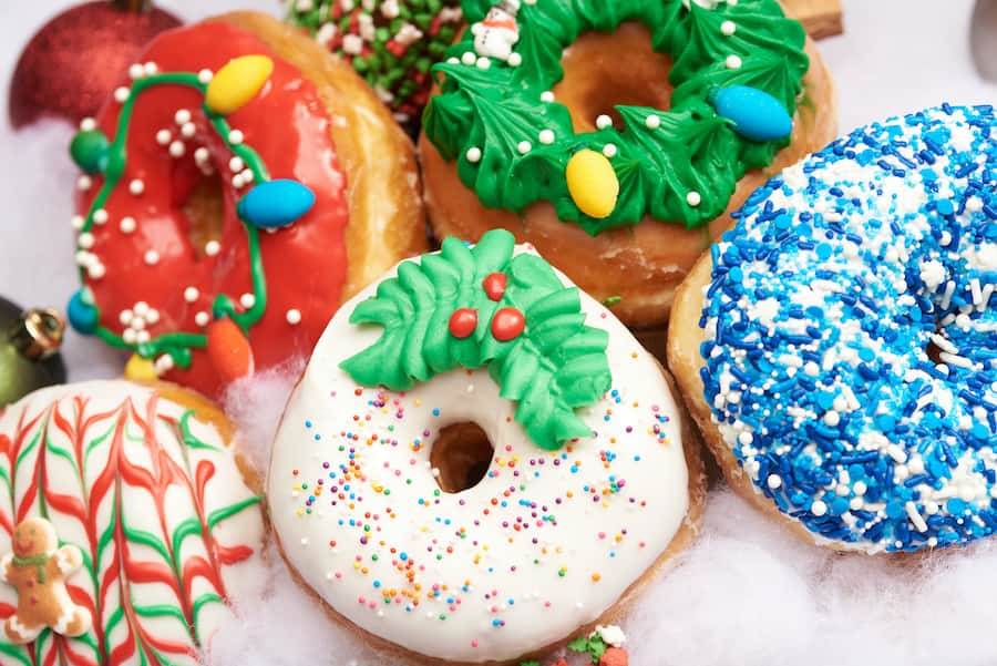 - Half Dozen Christmas Donuts: A half dozen yeast donuts decorated with holly jolly edible décor, luscious buttercream, and toppings showcasing colors and images of the season