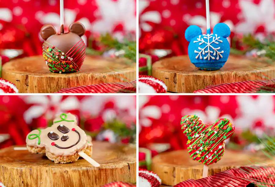 - Mickey Mouse Holiday Crisped Rice Treat: Mickey Mouse-shaped cereal treat dipped in red-colored white chocolate, drizzled with green-colored white chocolate, and sprinkled with holiday cheer décor
