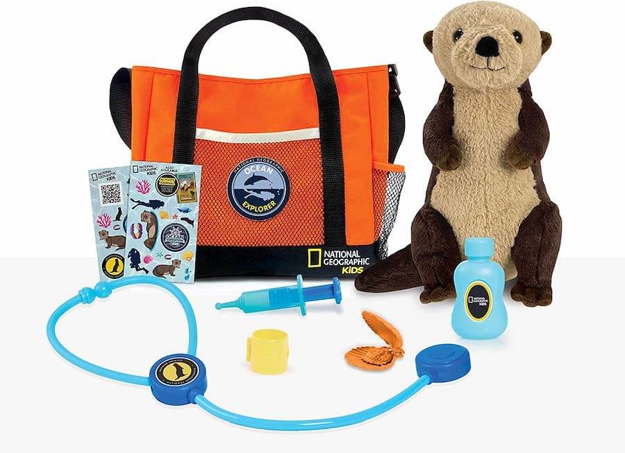 The National Geographic Otter Care & Nurture Set includes an interactive sea otter plush, and travel bag; while the National Geographic Chimp Veterinarian Kit comes with interactive chimp plush, a travel bag, play vet care tools, and a toy banana snack