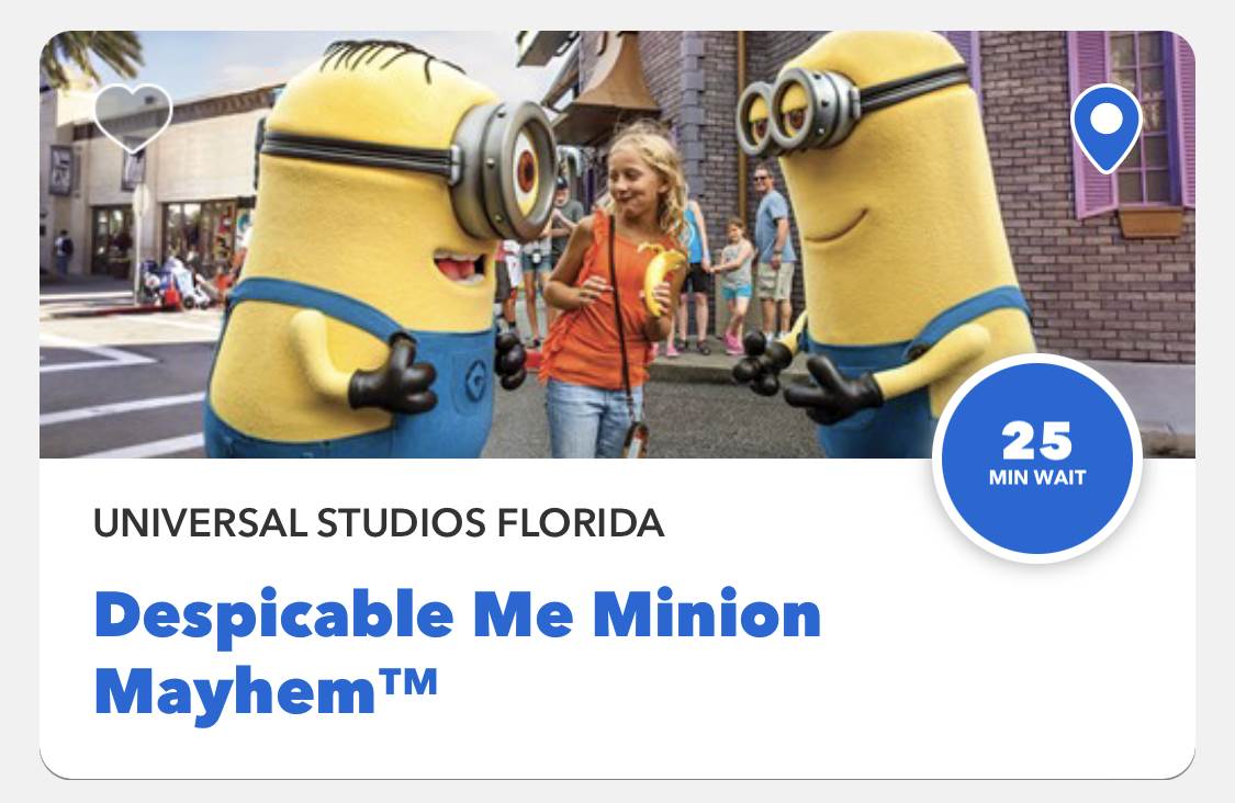 - As of publishing time, the only attractions to be listed as open on the Universal Orlando app are Despicable Me Minion Mayhem, with a 25 minute wait, and Storm Force Accelatron, with a 5 minute wait.