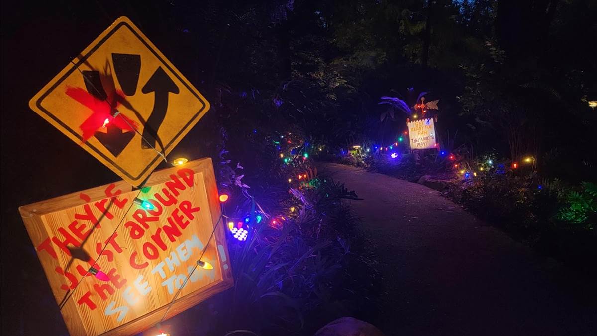 The lights go through a variety of different patterns, timed to the quirky Donald’s Dino Bash holiday music.