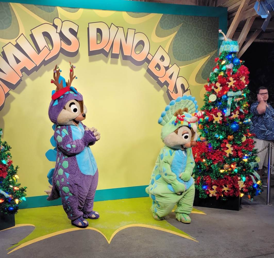 Chip and Dale’s Dinosaur costumes receive a little holiday flair for the season.