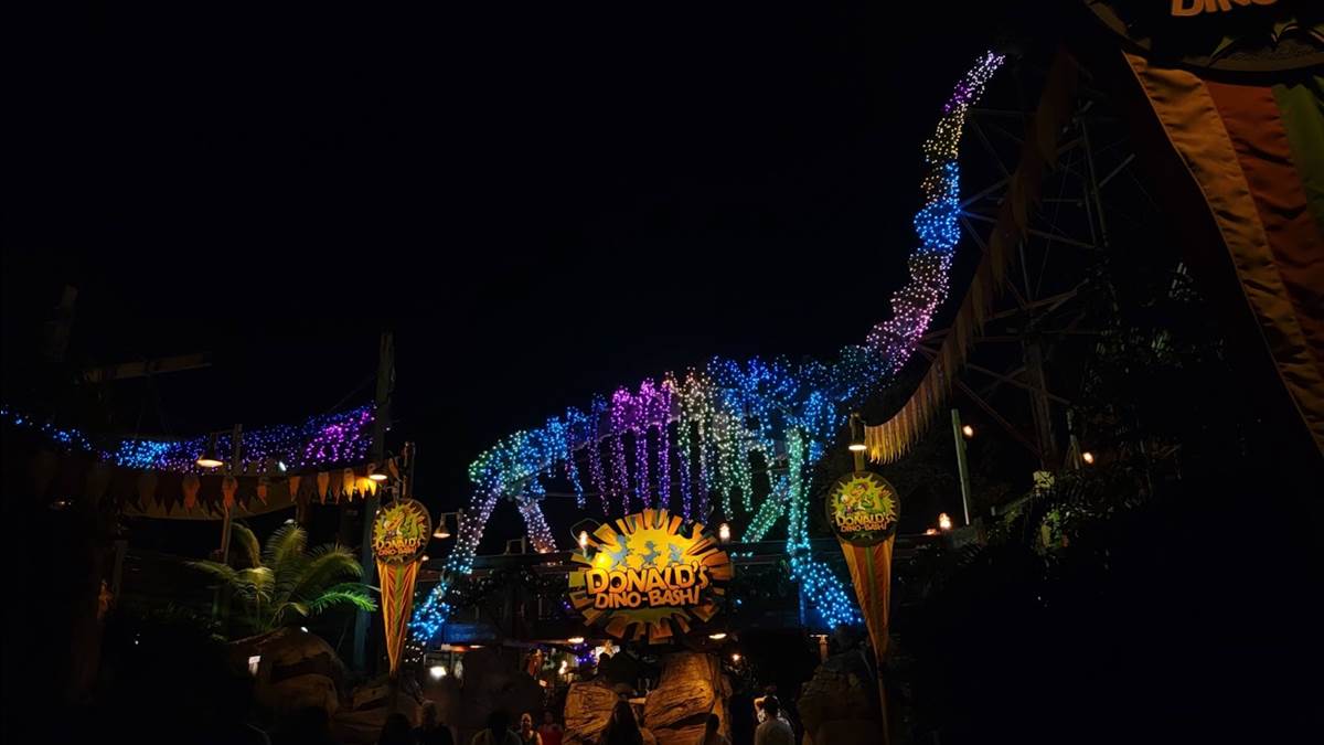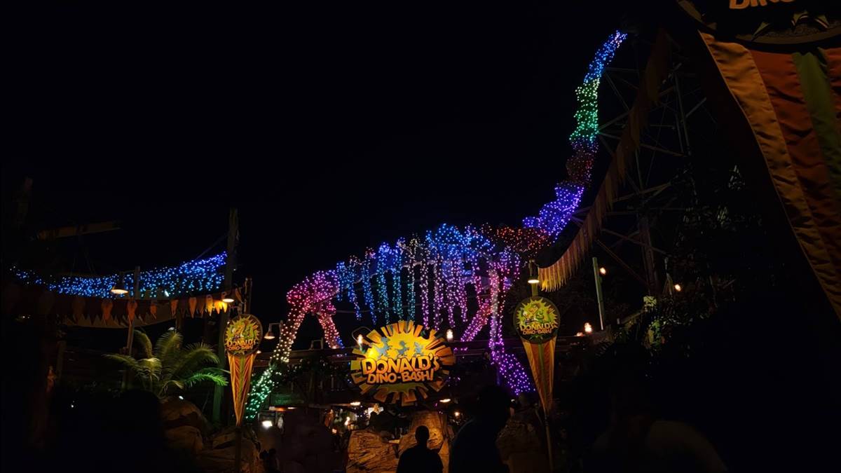 More festive fun can be found over in DinoLand U.S.A. where the Olden Gate Bridge is decked out as Santa Claus and covered in lights, making for quite the spectacle at night!