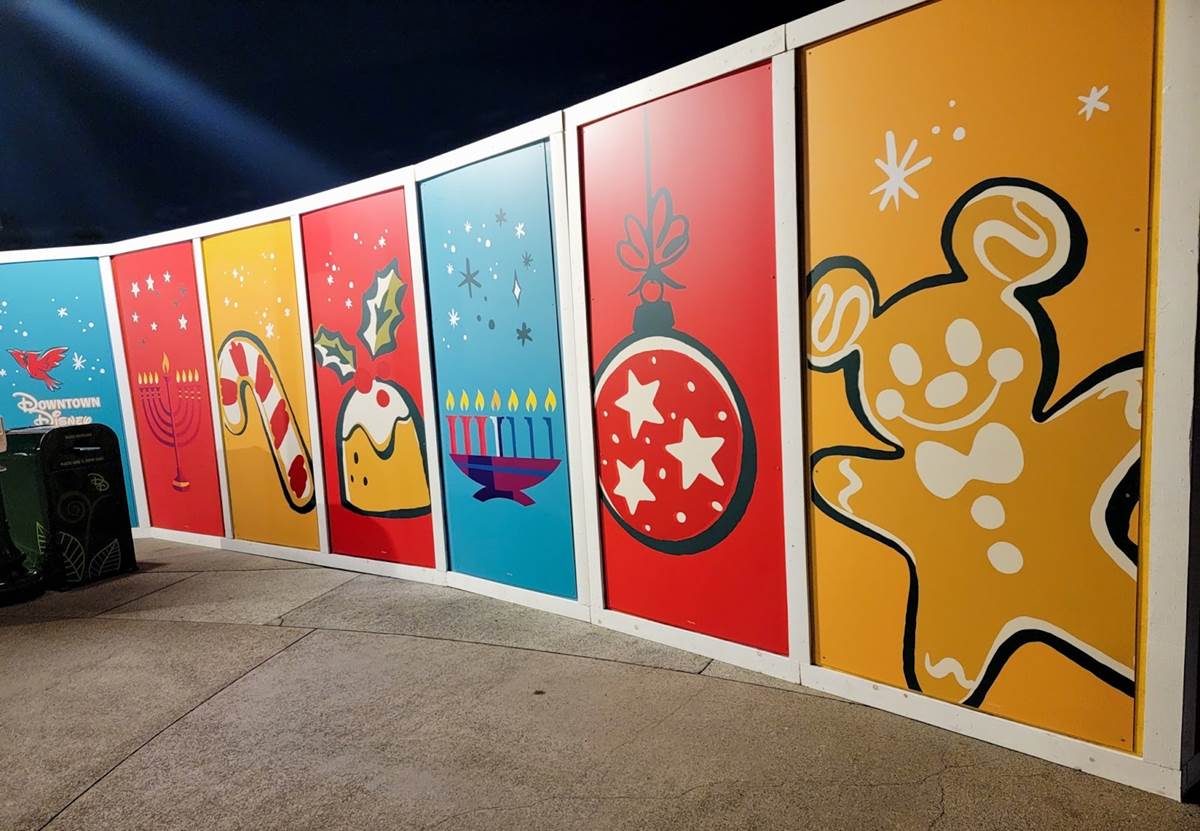 We begin on the western-most part of Downtown Disney, where the construction walls have received a festive overlay.